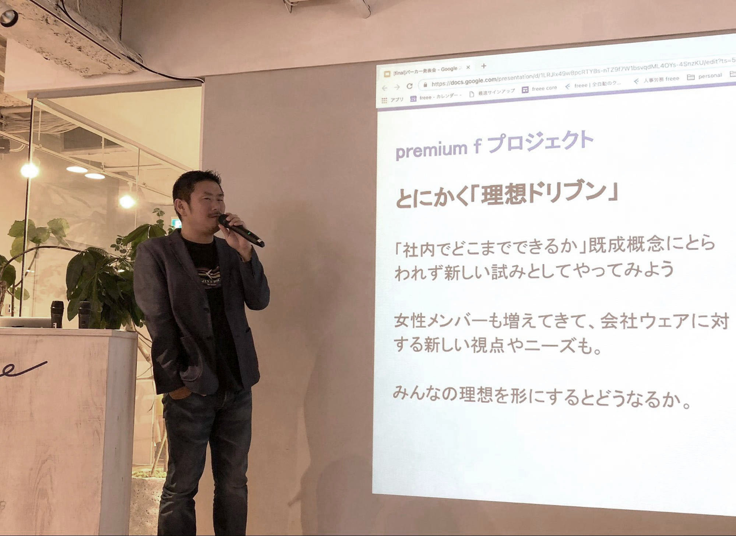 社内を見渡すと「premium f」を着た社員がたくさんいました。
