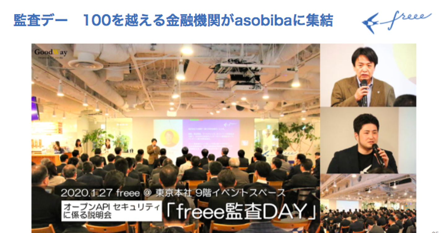 そのひとつとして、2020年頭に、効率的にAPI連携のためのセキュリティ監査を進めるべく『freee監査DAY』を開催しました。これはfreeeにいろんな金融機関の方を招いて、freeeのセキュリティの取り組みに関して一括実地説明を行うもの。そこで『銀行とスタートアップが協業して、新しい価値をつくっていくんだ』というfreeeのスタンスを強く表明しました。この頃には、会社として丁寧に報告を重ねてきたことで、金融庁からも信頼されるプレイヤーになれていたと思います」
