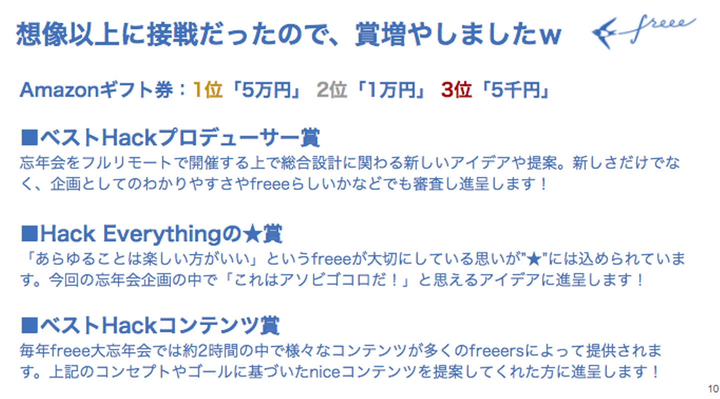 こちらは、忘年会をフルリモートで開催する上で、総合設計に関わる新しいアイデアや提案に送られます。また新しさだけでなく、企画としてのわかりやすさやfreeeらしいかどうかなどの視点も審査基準となりました。