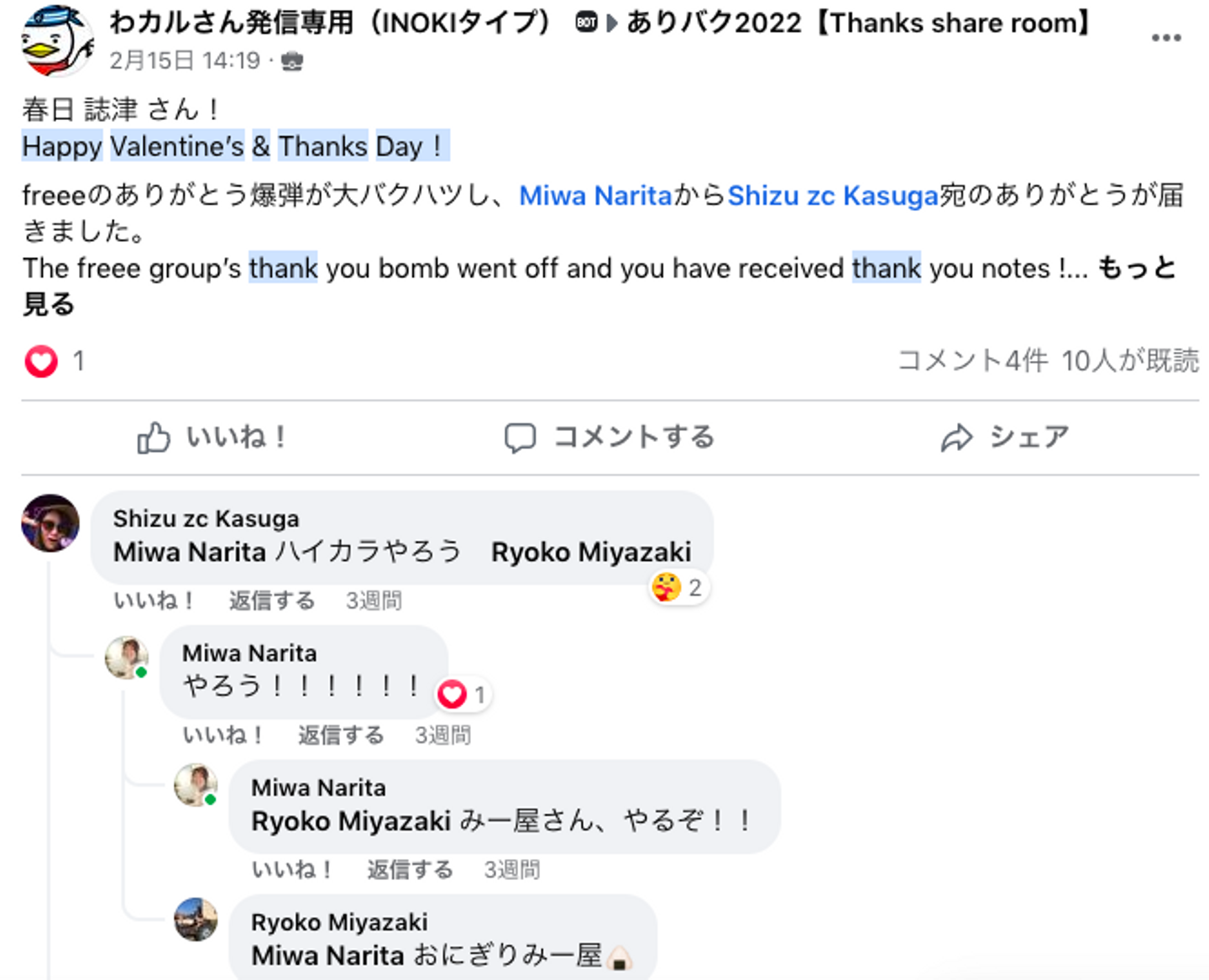 公開すると、その人の素敵な部分がオープンにシェアされたり、スレッド内でコミュニケーションできるようになり、社内にインタラクティブ性が生まれることが狙いの一つです。