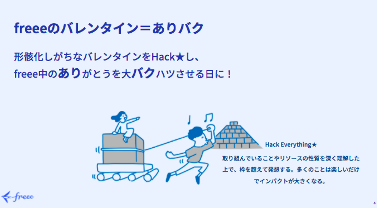 freeeには様々なカルチャーがあり、採用サイトにも掲載していますが、このイベントは『Hack Everything★』や『社会の進化を担う責任感』に基づいています。