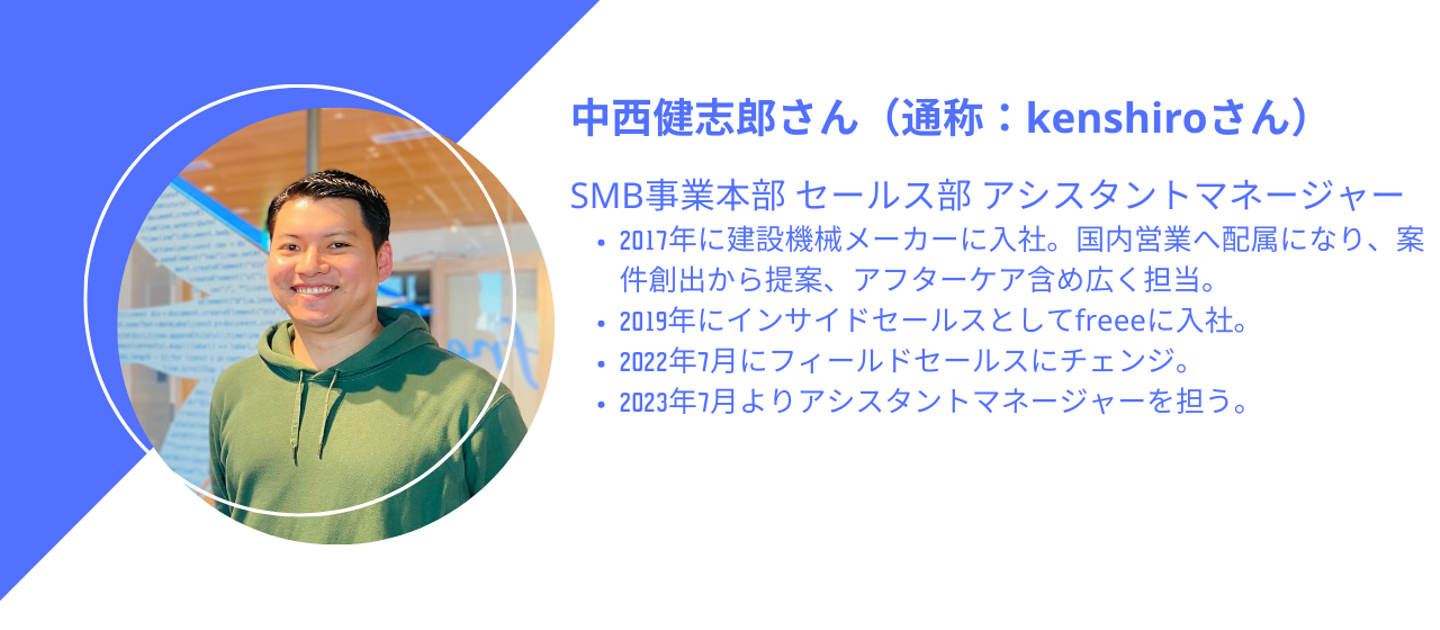 今回お話を伺ったのは、全国約20万社強ある中堅・中小企業様を対象にサービスの提案を行っているSMB事業本部において、インサイドセールスからフィールドセールスにキャリアチェンジをし、現在フィールドセールスのアシスタントマネージャーを務める中西健志郎さん。