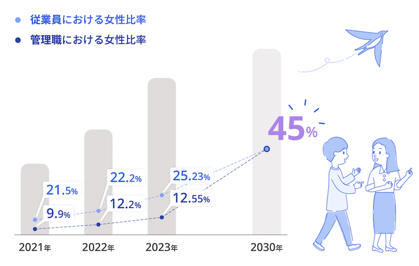 (▲従業員における女性比率、女性の管理職比率のロードマップ)