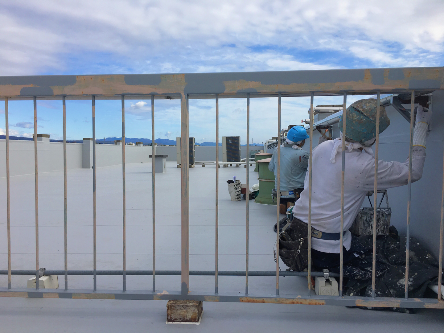 屋上防水工事がほぼ終わり、貼り付けられたシートが映える絶好の見学日。