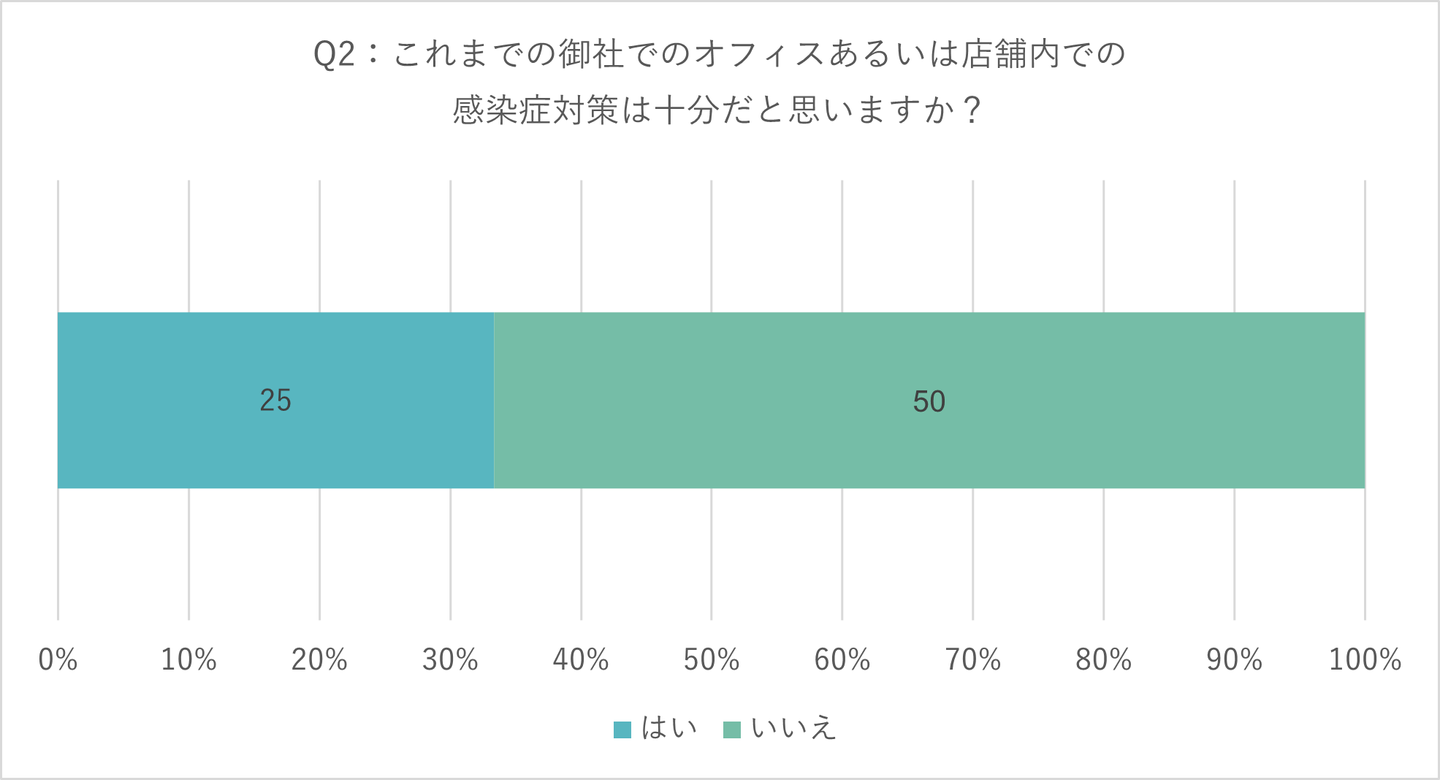 今回は感染症対策に関するウェビナーだったため、そのタイトルにちなんで、ウェビナー終了後のアンケートでは、「感染症対策が十分であると思うか」「感染症対策にこれまで執行した予算はいくらか」などについてお伺いしました。また、その結果を次のウェビナーや、今後ウィルストップの営業トークや資料作成などに活用するため、分析を始めました。