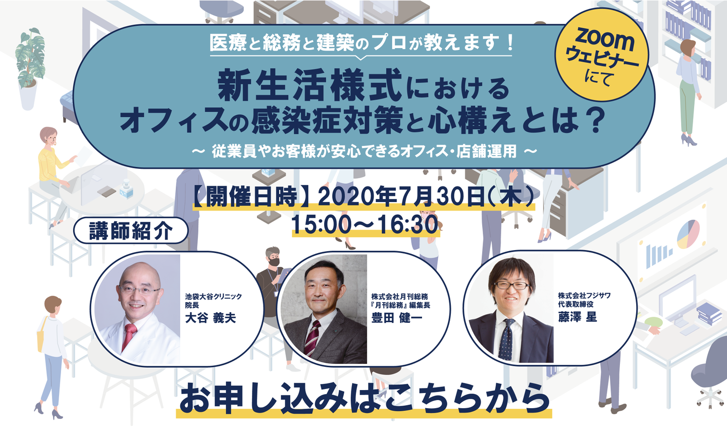 第1回目のウェビナーは、『医療・総務・建築』の視点からの情報提供を考えていたため、『医療』からは現役医師で多数のメディア出演等でご活躍されている『池袋大谷クリニック / 院長:大谷様』、『総務』からは日本で唯一の総務の専門誌「月刊総務」の編集長であり、総務の現場を知り尽くしている『株式会社月刊総務 / 編集長:豊田様』、『建築』からは創業98周年の建設業である『株式会社フジサワ / 代表取締役:藤澤』が登壇することになりました。