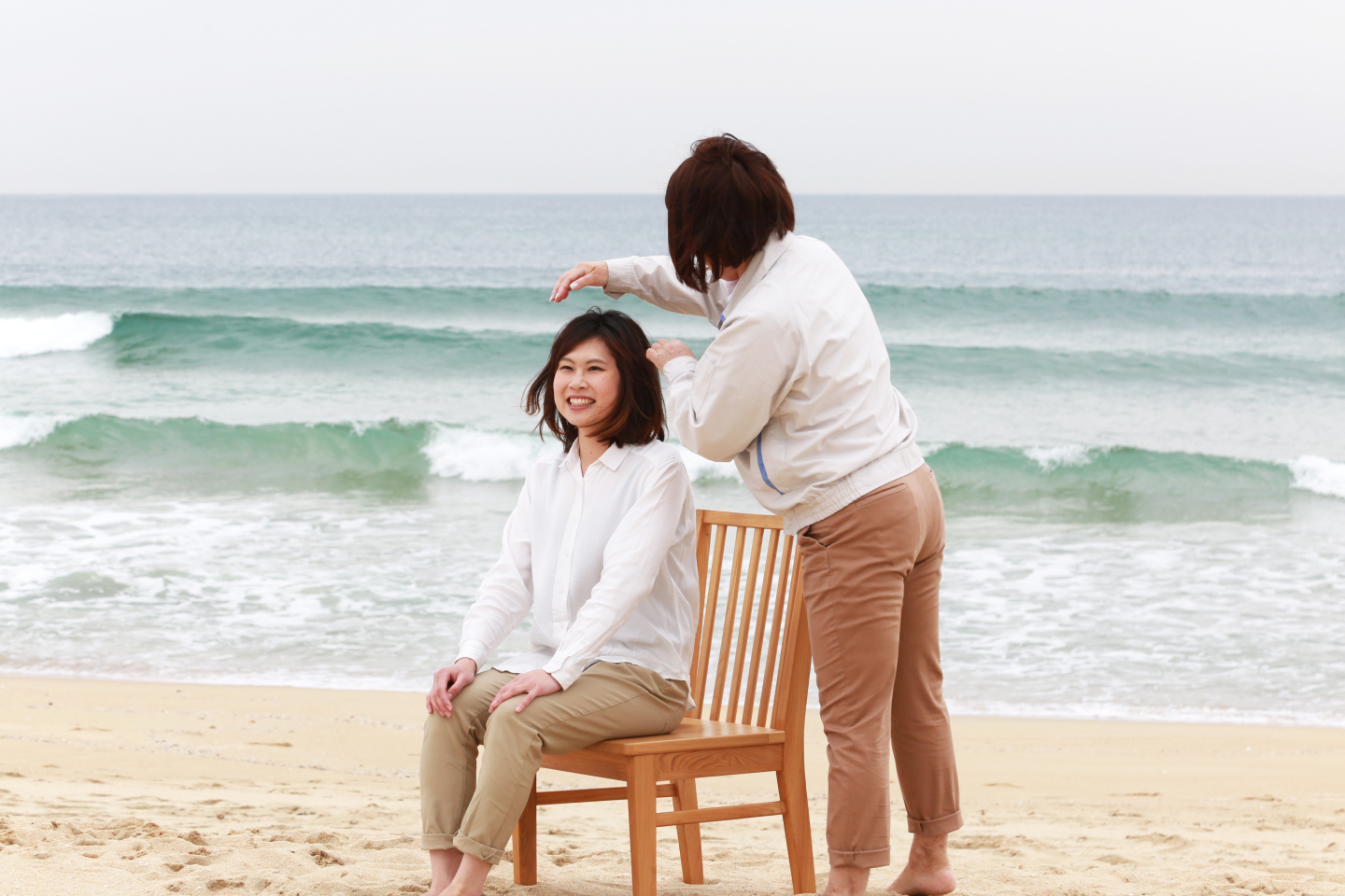 ▼そして、ついに撮影スタート(^^)スタッフ同士で髪の乱れを整えます。