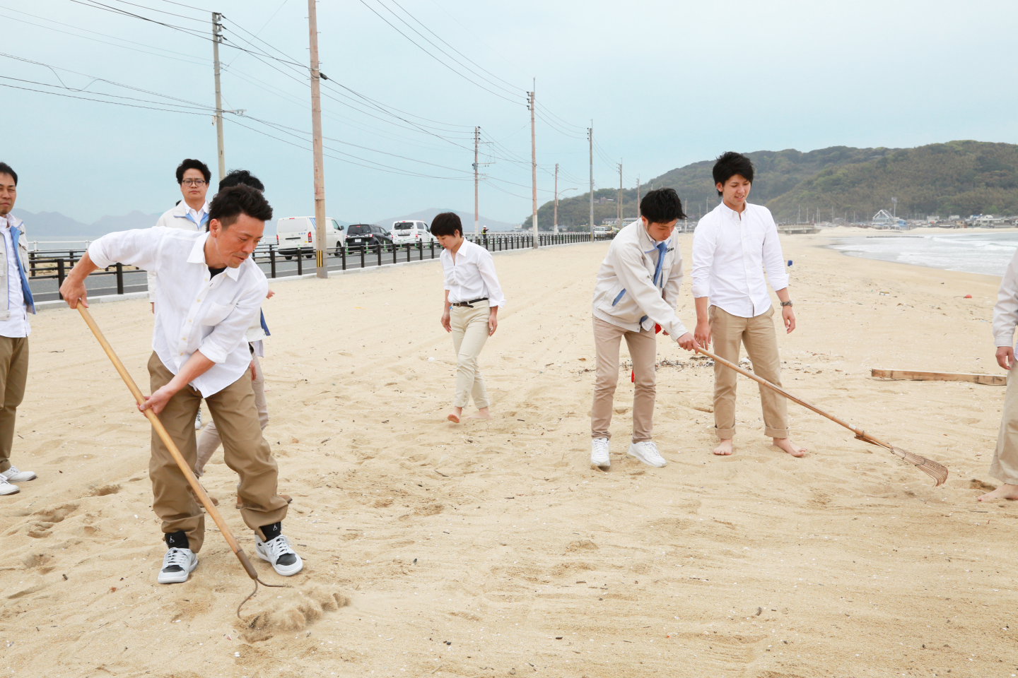 ▼撮影にあたって、まずは浜辺の掃除から始めます♪