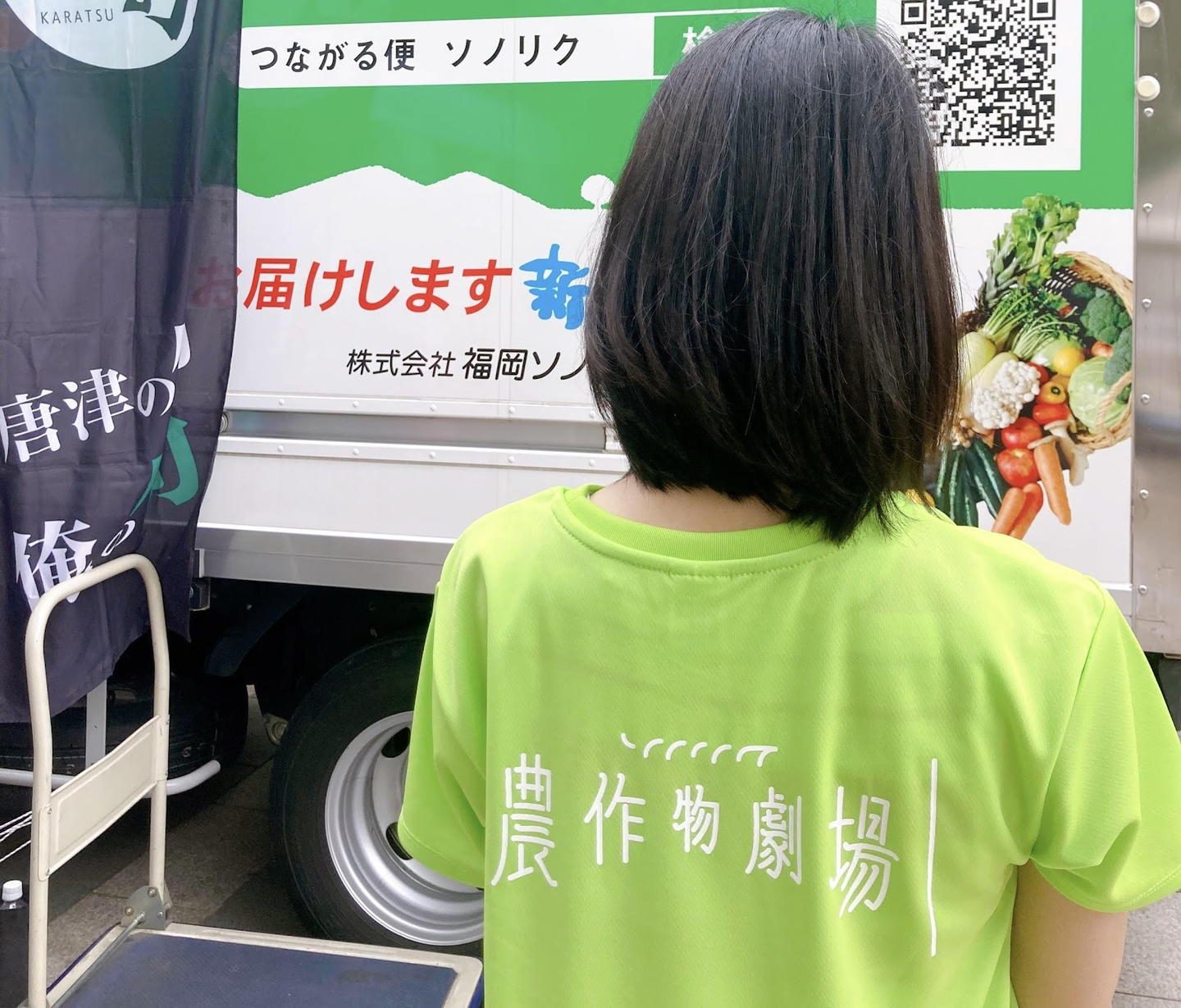 この日のために作ったチームTシャツを着用して臨みます。チームメンバーの「かっこよさよりも、とにかく目立つ色で!」という意見から、デザイナーさんと相談して明るいグリーンに。本当は農家の方も一緒に売り場に立ってくださる予定だったのですが、台風対策のため福岡ソノリクの社員だけで対応することになりました。
