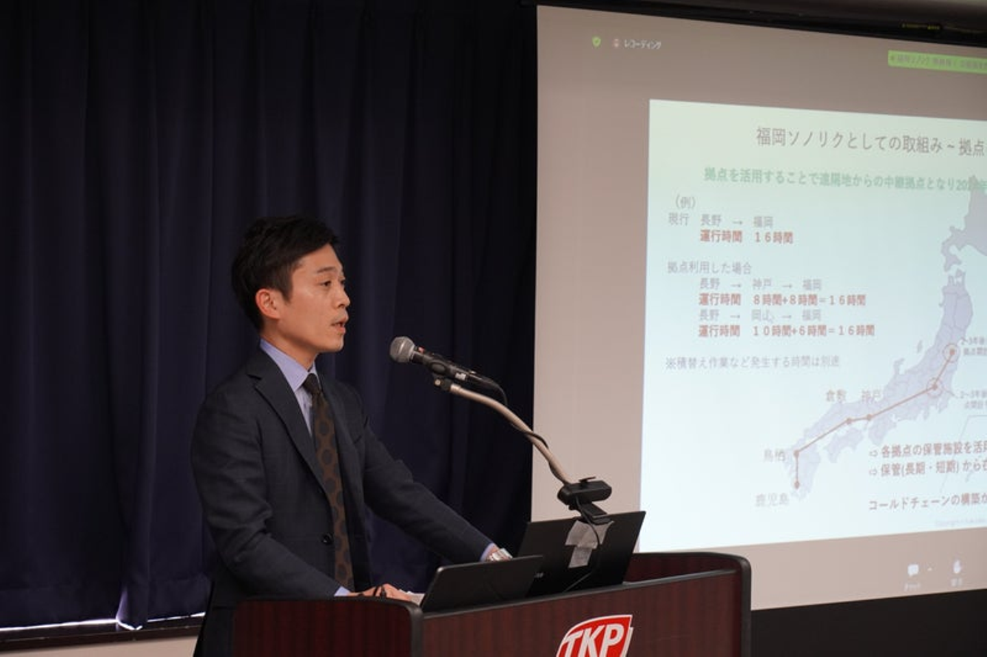 まず福岡ソノリクの担当者が登壇し、弊社が持つ物流拠点機能や長期保管機能、品質管理機能を活用して、物流2024年問題の解決を目指す取り組みについてお話しました。