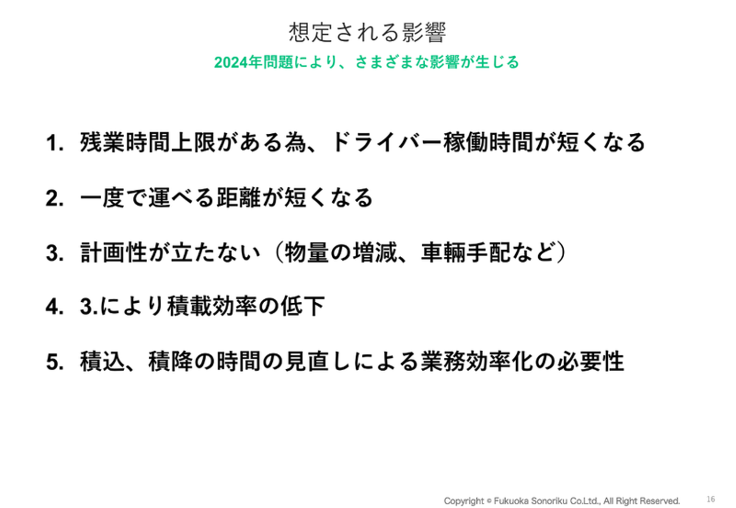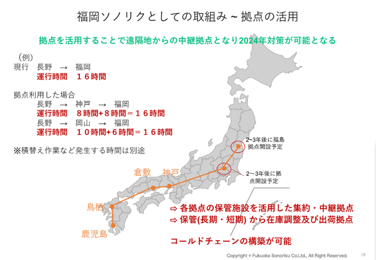 たとえば2024年以降はドライバーの拘束時間が厳しくなり、現在のような長時間の運転ができなくなります。そこで岡山県など西日本各地にある福岡ソノリクの物流拠点を遠隔地からの中継地点として活用することで、運行時間を削減して課題解決を目指す事例を紹介しました。
