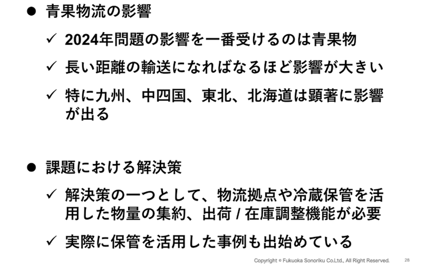 物流2024年問題において最も影響を受ける領域である青果物流の当事者である私たちが、実際の取り組み事例や具体的な数字を語ることに意義があると思います。物流2024年問題の理解を深め、どう立ち向かうのかを関係者の皆さんと一緒に考えていきたいです。