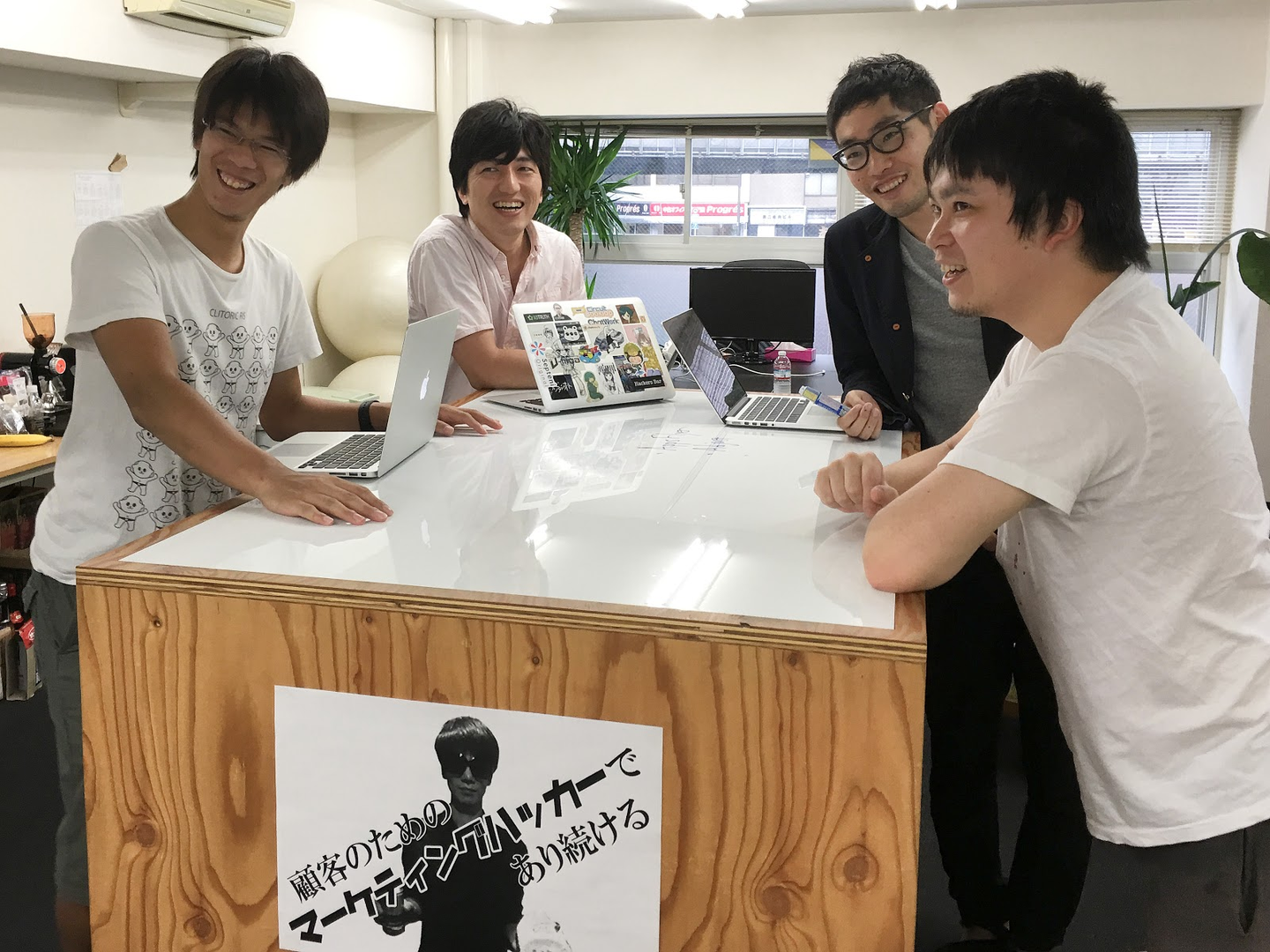 ▲2016年、まだマンションの1室がオフィスだった頃の有岡さん(左から2番目)と清水さん(左から3番目)