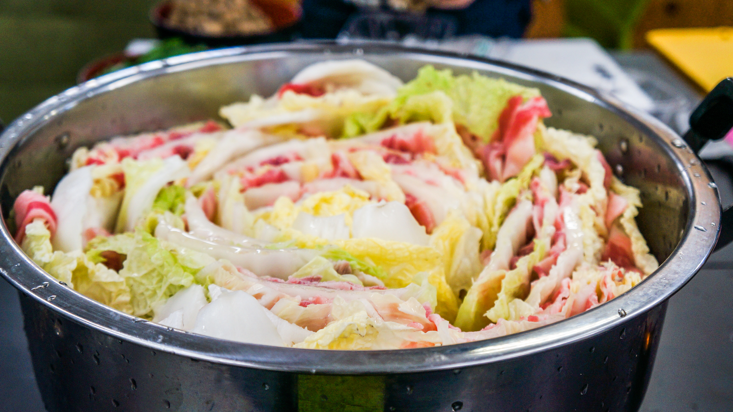 普段、関わりのないメンバーが混ざる機会を作るのを目標にして、皆の手が込んでる料理をテーマにしました。今週の料理は白菜と豚肉のミルフィーユ鍋です!
