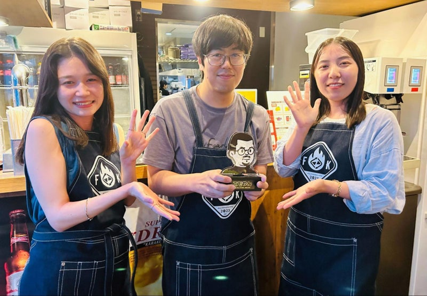特製トロフィーを持つのりさん(中央_西山)左:うっちー(内舘)右:筆者(斉藤)