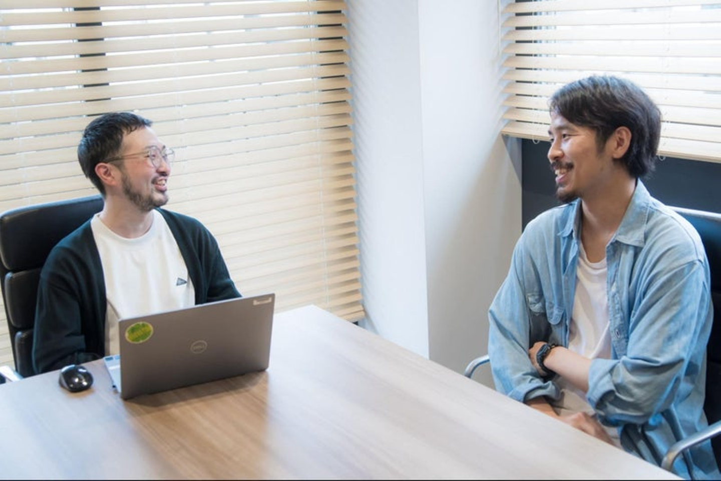 カスタマーサクセスの助さん(森田_写真左)に、「このアイテムをなくしたら、助さんのトレードマークの髭が半分無くなるかもしれないで!」と念押しする瀬川(弊社代表_写真右)