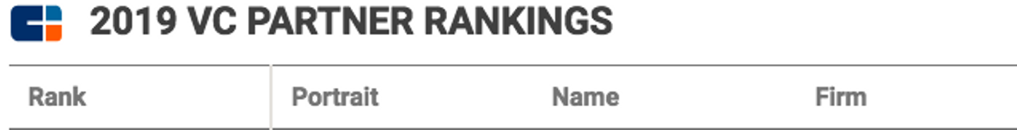 前2回の米国有名VCと比較すると、Founders Fundは小規模のVCだと言うことが伺える。しかし、その実績は規模の大きさを上回る形になっていることが以下の表(2019 VC partners Ranking) からも読み取れるだろう。