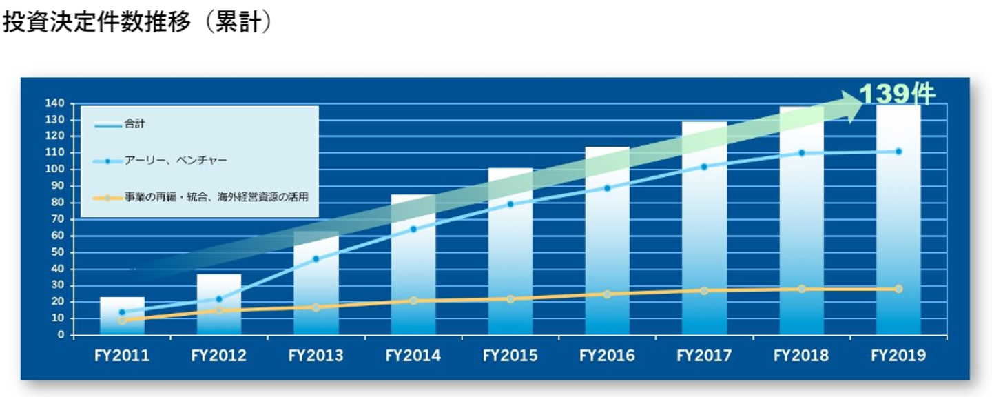 投資決定件数は139件で、Exit件数(売却を開始もしくは完了した案件の累計)は48件です。投資決定件数(計139件)では、アーリー、ベンチャー等が約80%となっていますが、支援決定金額(計1兆3120億円)では再編が60%弱の比率と最も多くなっています。ちなみに支援決定金額ベースでアーリー、ベンチャーは約20%です。また日本のみならず海外企業にも投資をしています。IPO/PO実績としてジャパンディスプレイやルネサスエレクトロニクスがあるように、VCだけではなく再生ファンド、PEとしての機能が大きいといえるでしょう。ただ前述のとおり件数ベースではアーリー、ベンチャーが多いことからも、いわゆるVCとしての機能も有しています。