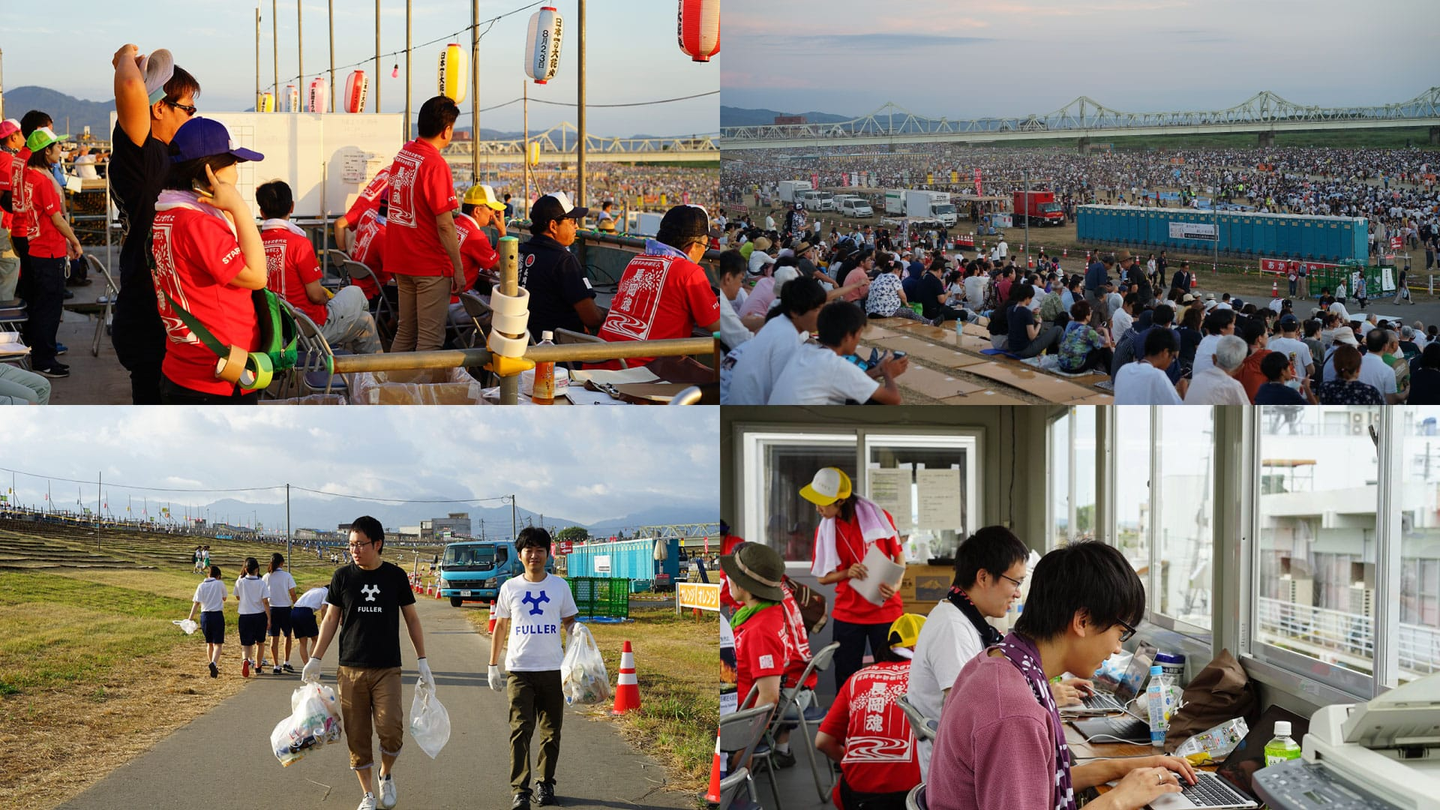 左上:長岡花火警備本部で警備に当たる皆様 右上:長岡花火観覧会場の様子