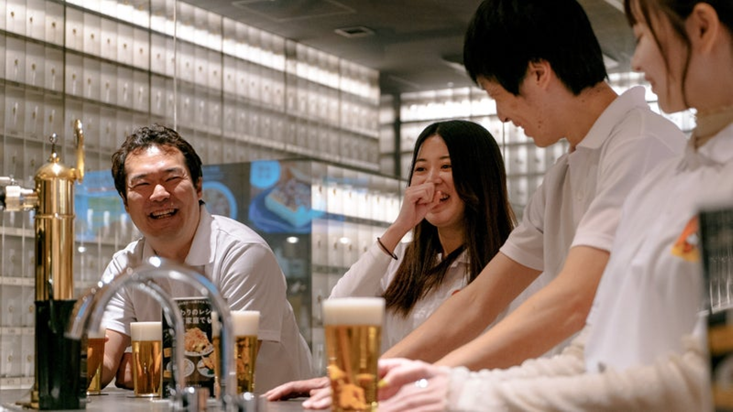 パートナー企業の施設『サッポロ生ビール黒ラベル THE BAR』でユーザー体験をする伊藤(写真左)