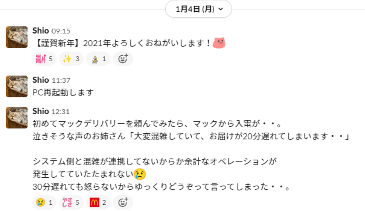 雑談を目的としたチャンネルを経験している人からするとこういう個別のつぶやきチャンネルでの運用はちょっと違和感があるかもしれませんね。