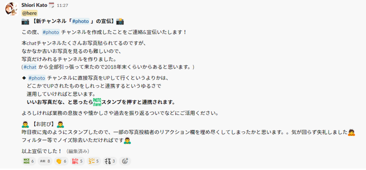 取り組み当初は私が率先して押していたスタンプも今は誰かが押してくれていて、私も社員としてphotoチャンネルを楽しめるようになっています。