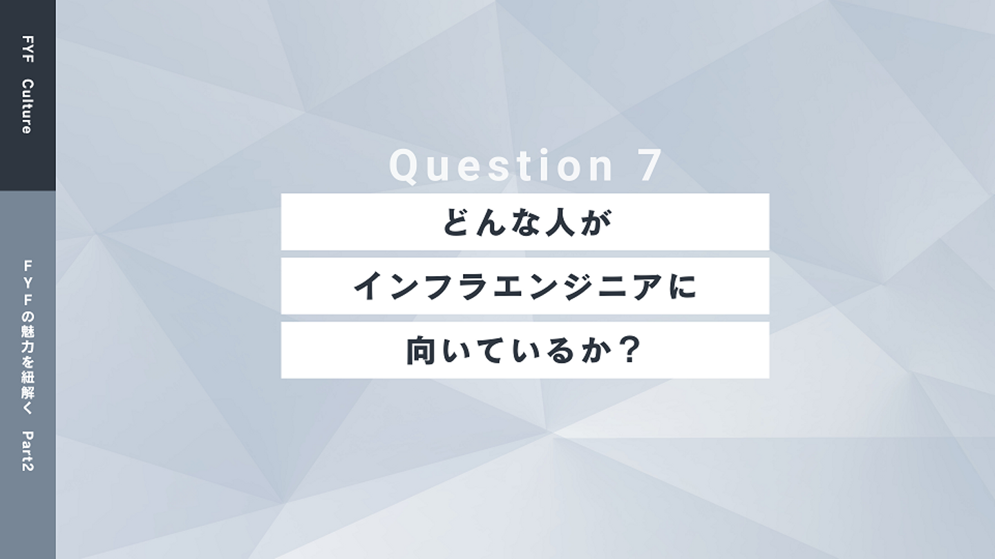 いかがでしたでしょうか。今回は、当社で働く社員の声を基に、「FYFの魅力を紐解く Part2」をお送りいたしました。当社やインフラエンジニアの魅力が、少しでも伝わりましたでしょうか。