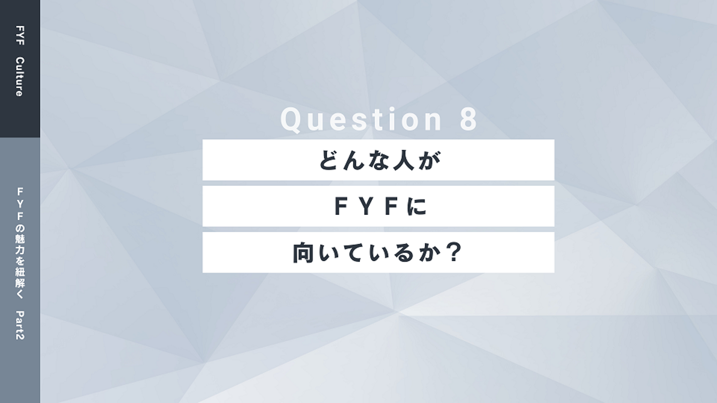 前回に引き続き、社内アンケートの結果を基に、「FYFの魅力を紐解く Part2」をお送りいたします。