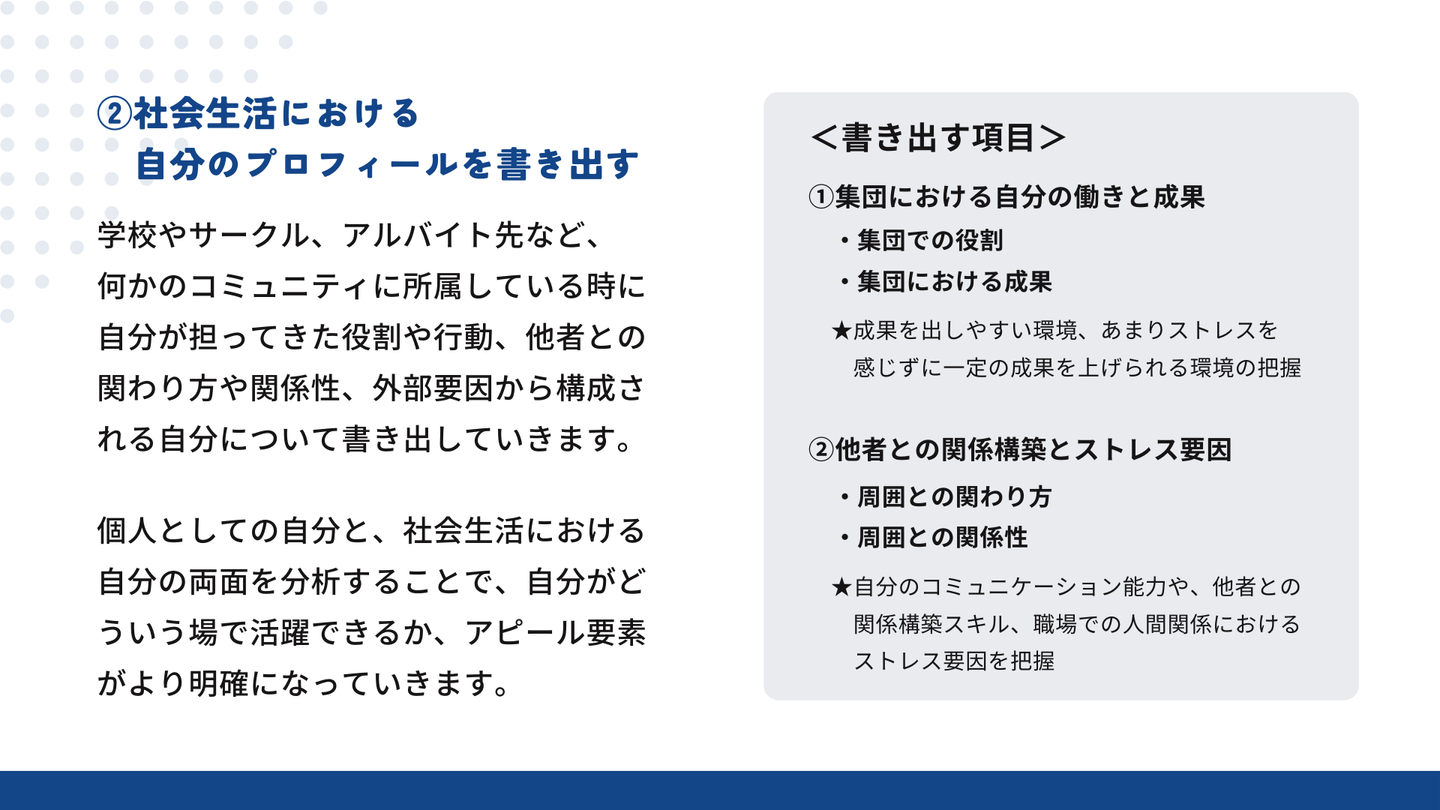 個人としての自分と、社会生活における自分の両面を分析することで、自分がどういう場で活躍できるか、アピール要素がより明確になっていきます。