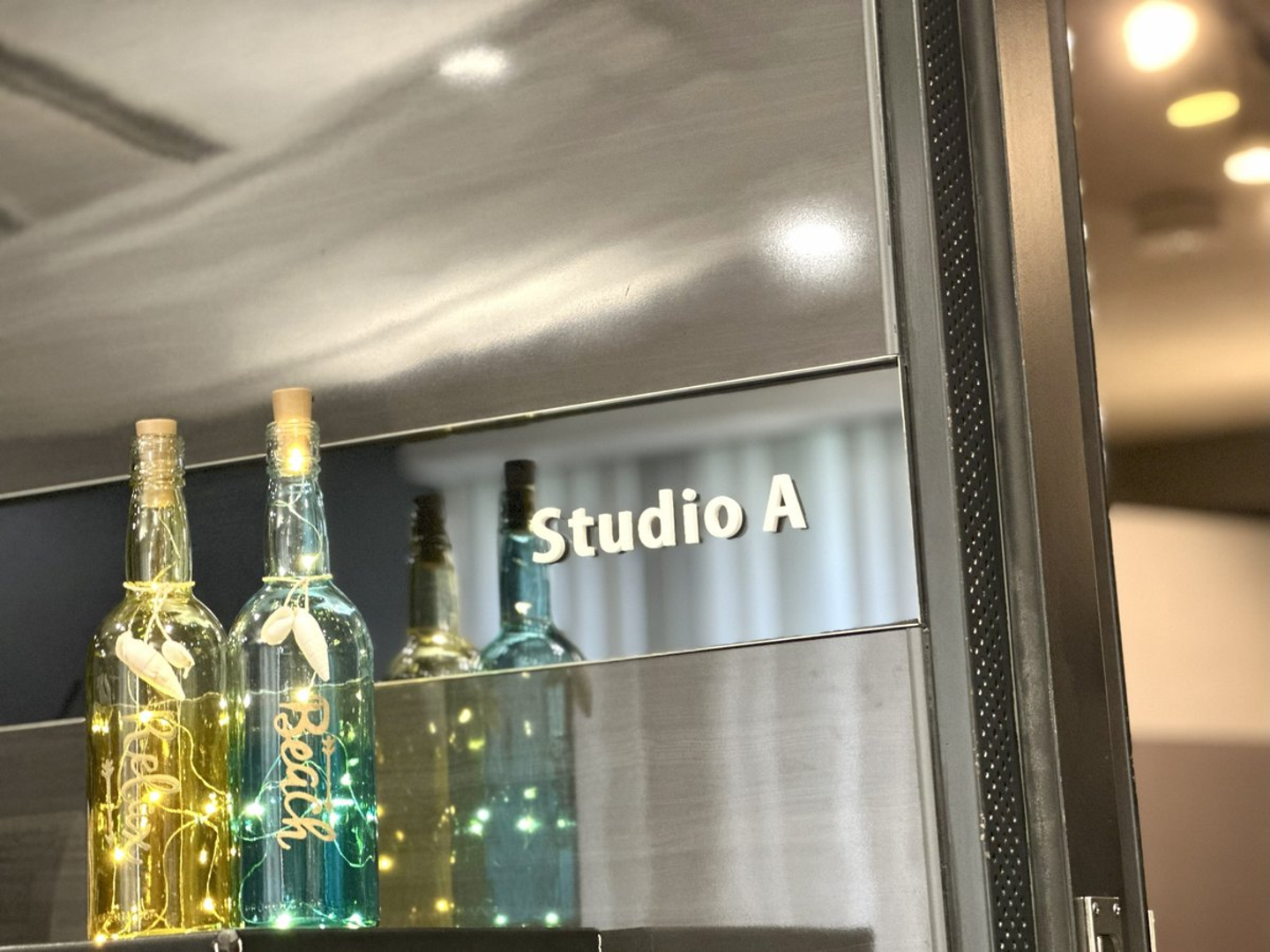 スタジオへと続く通路や、スタジオ前にも、ちょっとした装飾をしています。