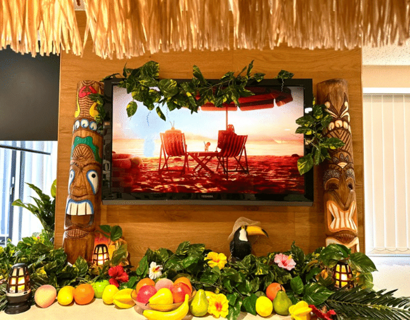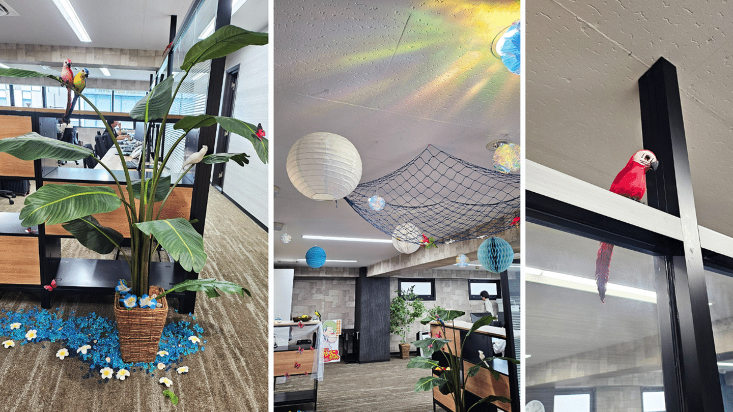 夏には、暑い中ご来社されるお客様に、少しでも涼しい空間で常夏気分を感じてもらえたら、という想いを込めて、「南国リゾート」をイメージした装飾を行っています。