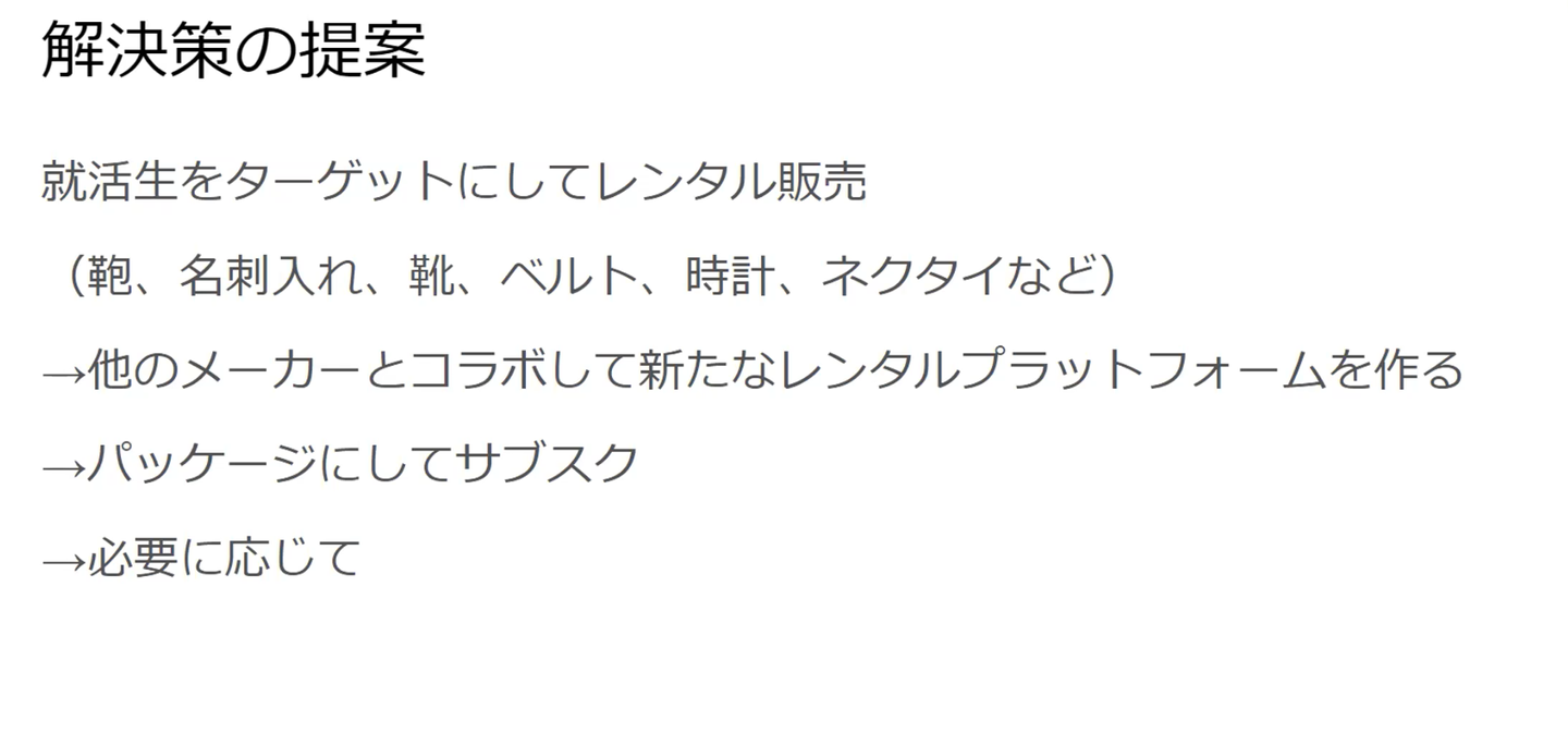 2つ目のチームは、「就活生をターゲットとした、サブスクライブ型レンタルプラットフォーム」を提案。就職活動時代にレンタルをすることで、将来収入が増えた時に選択肢として上がることがねらい。