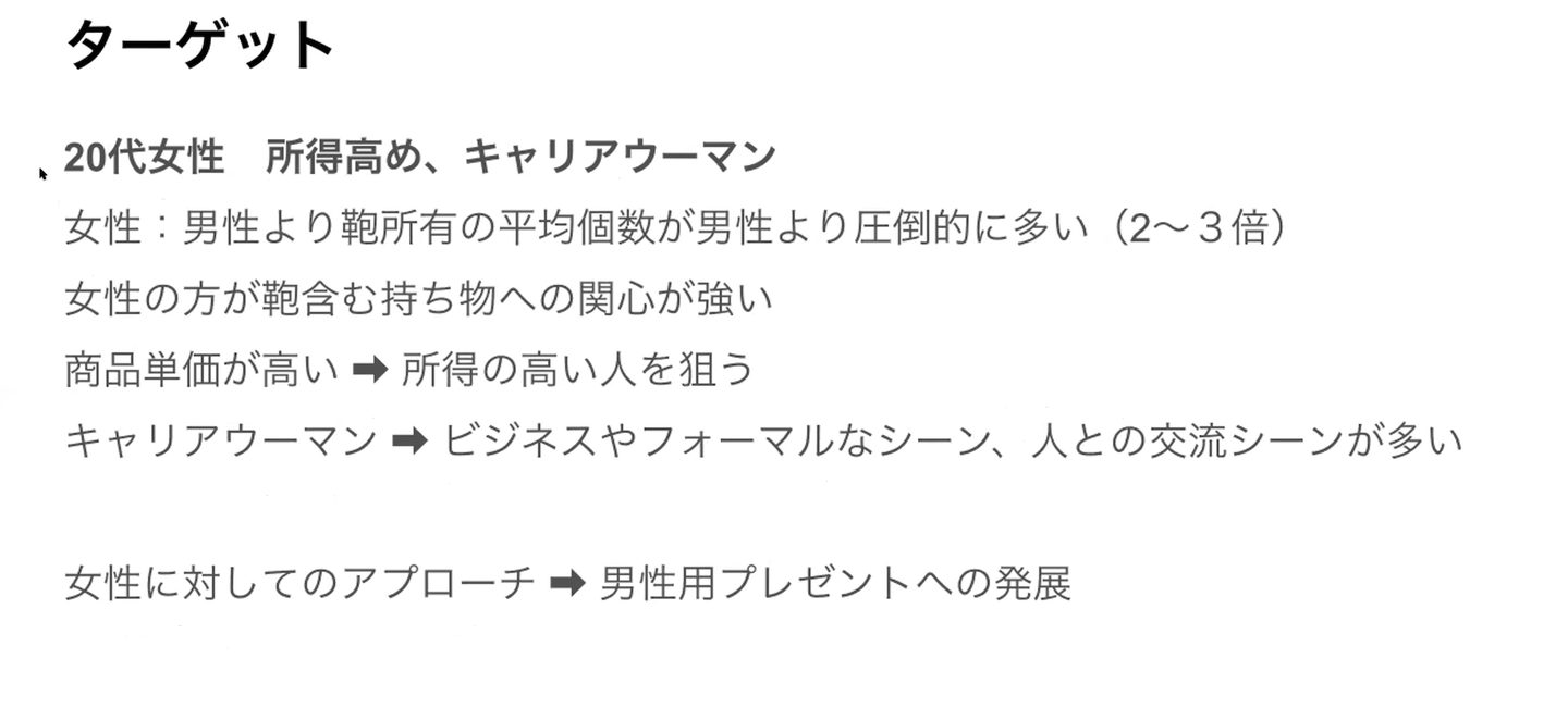 お題の企業の3C分析や、海外高級ブランドやお手頃価格のブランドの競合他社の分析後に、所得が高い女性をターゲットにしました。
