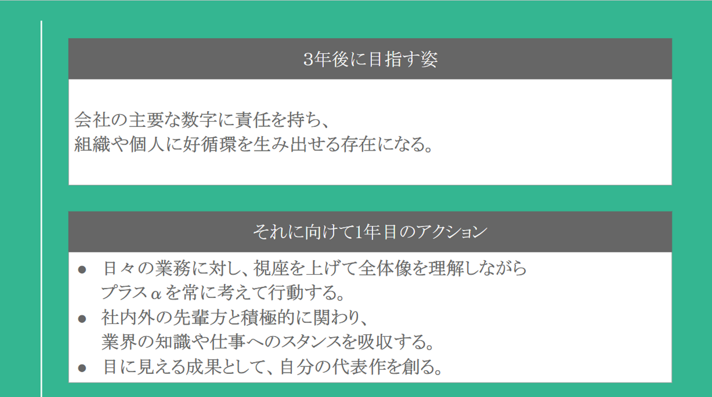 会社が設定した1年目のゴールは『幹部としての素養を身につけ、成果を出している。成果に強くこだわる。』こと。