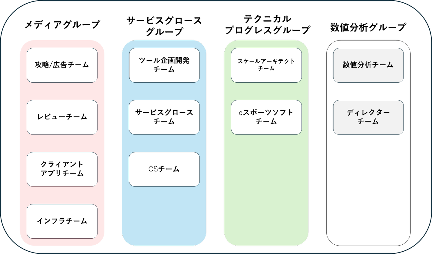 スケールアーキテクトチームとeスポーツソフトチームの2つのチームがあり、それぞれ業務が大きく異なります。