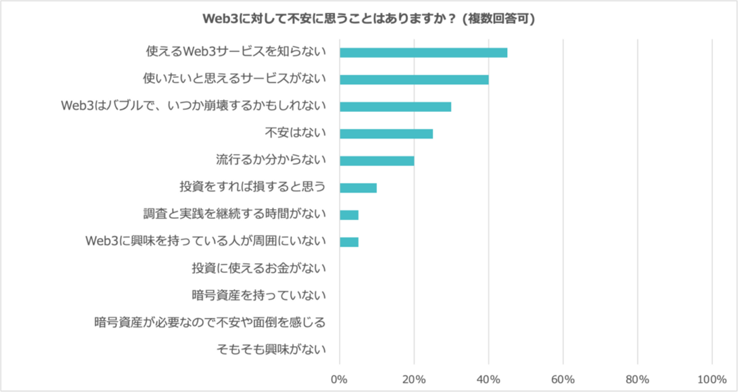 Web3の不安として「使えるWeb3サービスを知らない」「使いたいと思えるサービスがない」が上位を占めました。Web3自体への興味はあるものの、その実、満足いくサービスにはまだ出会えていないようです。