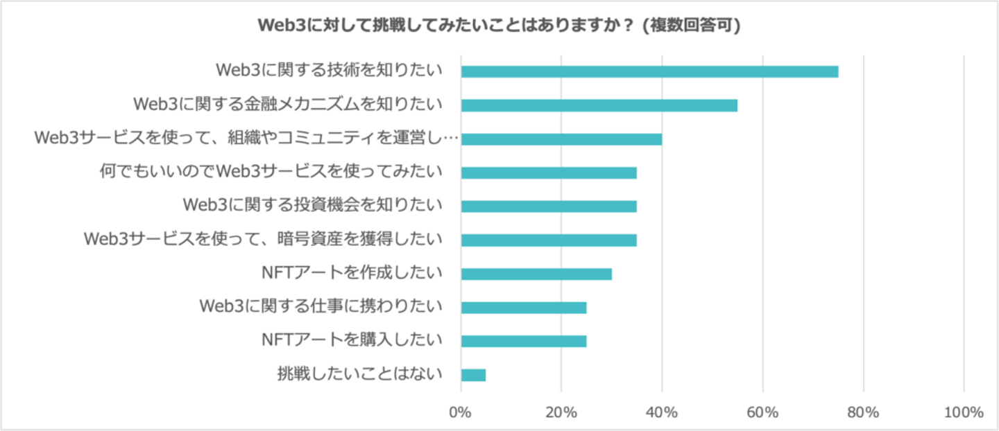 Web3への挑戦としては「Web3に関する技術を知りたい」が最も多い回答でした。暗号資産の獲得や投資よりも、Web3を構成する技術や金融知識を獲得することに、興味が向いているようです。また3番目の回答数を得たコミュニティ運営から、DAOに代表される分散型自律組織への興味の高さが伺えます。