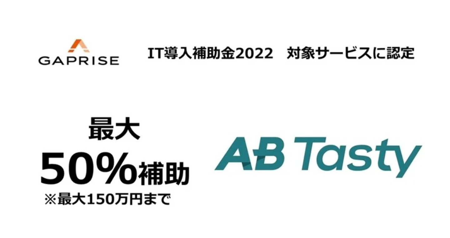 当社は2021年度に引き続き、2022年もIT導入支援事業者として登録され、ABテスト/パーソナライズテクノロジーの『ABTasty(エービーテイスティ)』が対象サービスとして認定されました。これにより、中小企業・小規模事業者様がABTastyの導入をおこなう際、導入費用の最大50%(最大150万円)が補助金申請可能となりますので、導入検討をされている企業様はこの機会にぜひお問い合わせください。