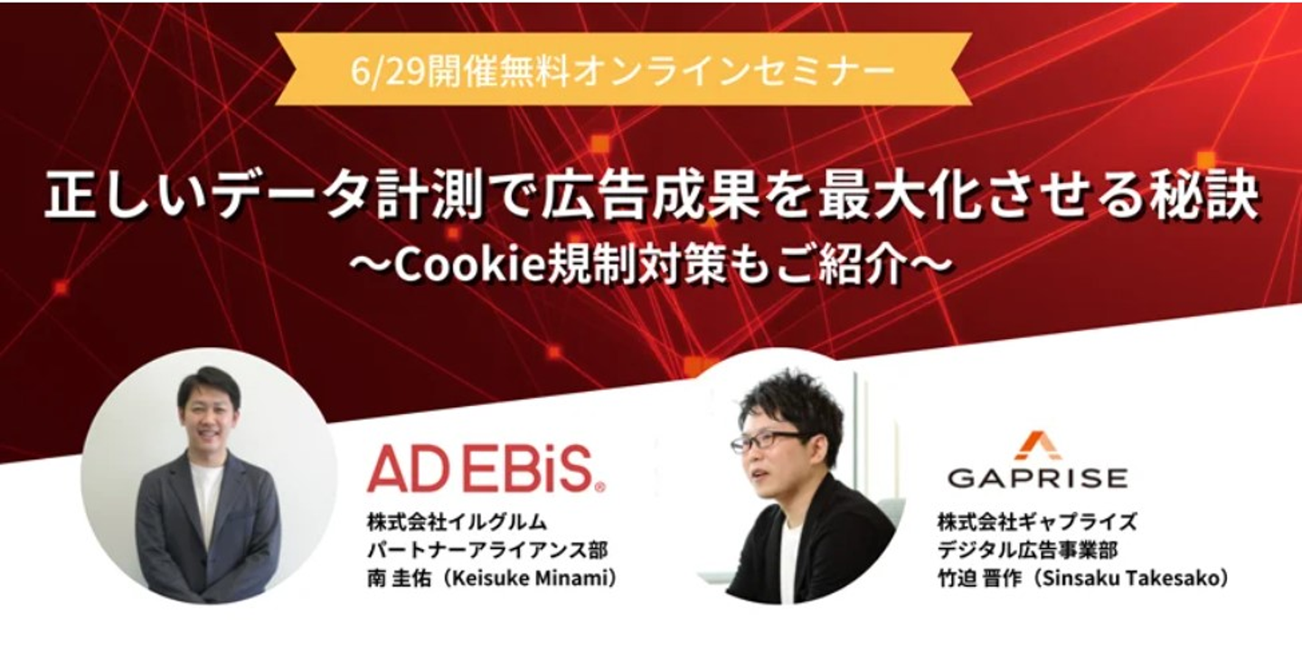 2022年6月29日に株式会社イルグルム様と共催にて、無料オンラインセミナー「正しいデータ計測で広告成果を最大化させる秘訣〜Cookie規制対策もご紹介〜」を開催しました。本セミナーでは、広告運用の中で、データを上手く活用できず成果を伸ばせない、正しい施策評価が出来ていないという方向けに、Web広告で成果を伸ばすためのデータ計測をテーマに二部制でお話ししています。