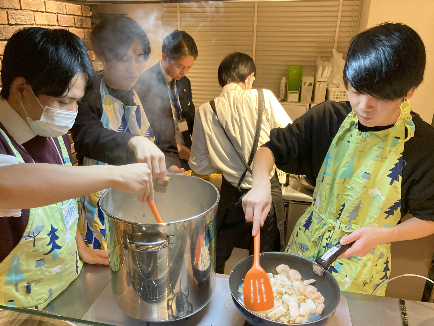 内定式のあとは、ワークで交流を図りながらの社会人基礎力研修と、内定者懇親会に向けて1年先輩の23新卒メンバーと一緒にカレー作り!
