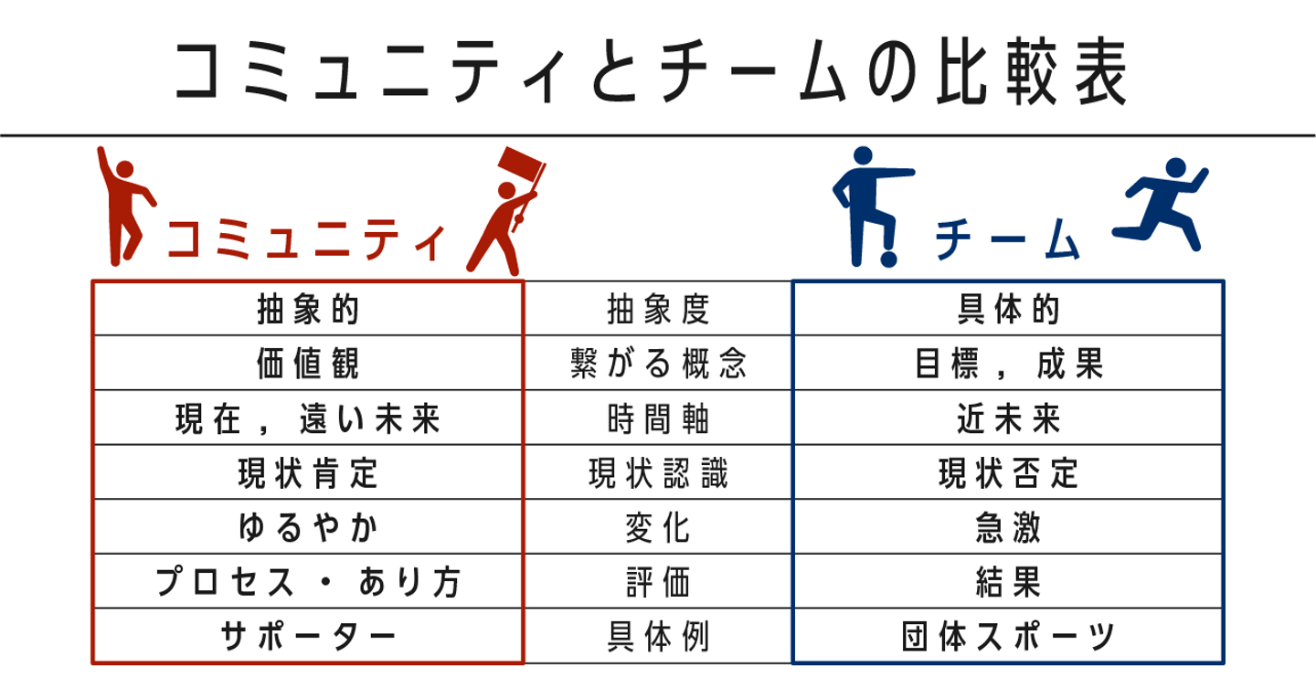 コミュニティ内では特定の限定された目的は存在せず、価値観で繋がります。仮に「達成すべき要素」がある場合はコミュニティの内部に「チーム」を作る必要があるようです。