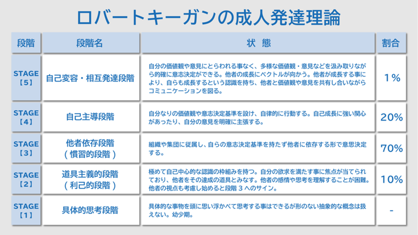 「心の成長」と言うとふわっとした印象を持たれるかもしれませんが、マインドプログラム設計の基礎となっているのは「成人発達理論」という発達心理学の一分野です。成人発達理論は、ハーバード大学教育大学院教授で組織心理学者のロバート・キーガンが提唱し、日本だとキーガンのもとで学んだ知性発達学者の加藤洋平氏が牽引している理論です。