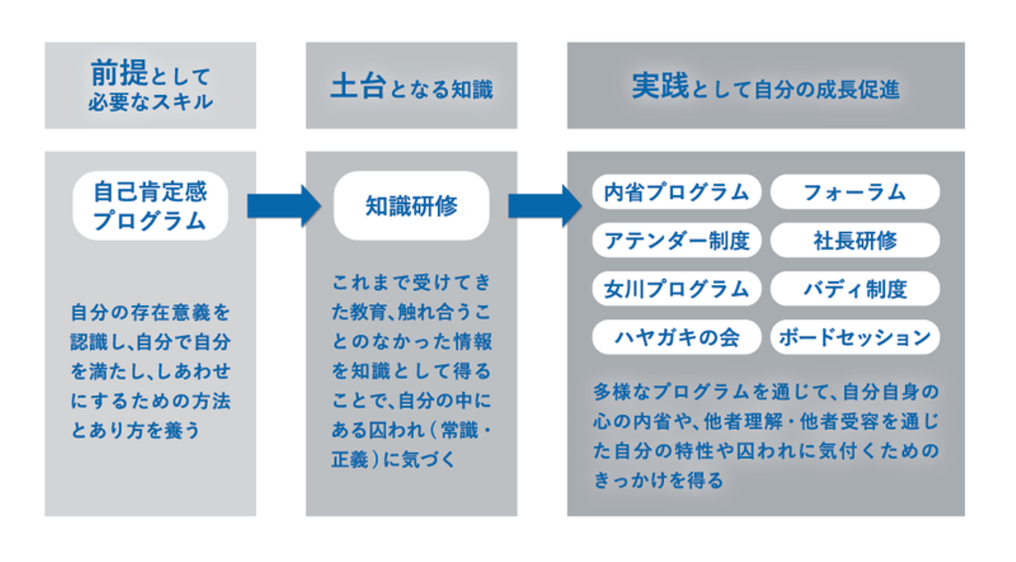 心の成長を支援するために実践しているのが、「マインドプログラム」と呼ばれる複数の成長支援プログラムです。マインドプログラムは、内定者研修~新卒研修時の自己肯定感プログラム、知識研修を経て入社後より実践されていきます。