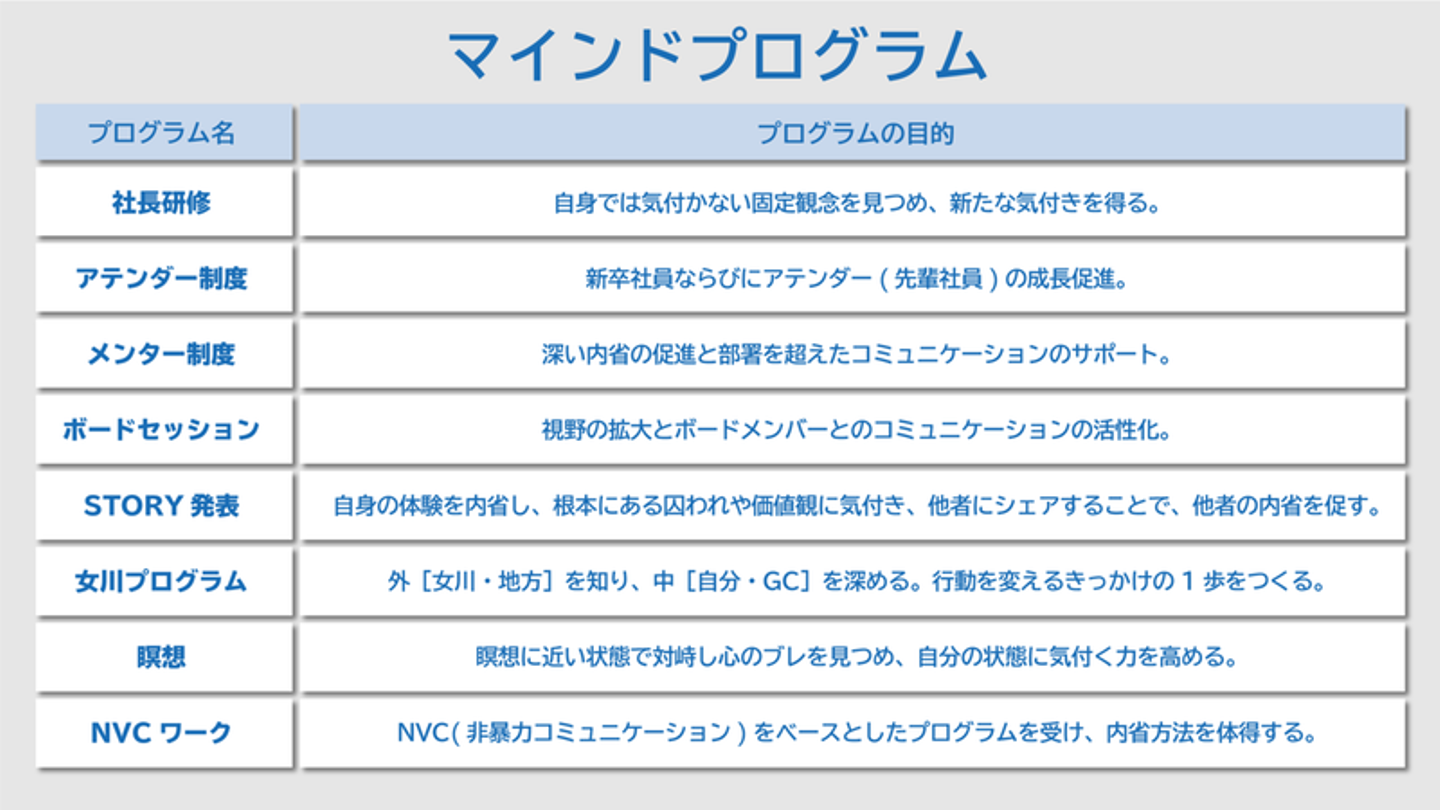 GCストーリーは「全従業員が幸福で調和していること」を企業理念の冒頭に置いています。真に幸せな状態とは心の成長が果たされ、周囲と深い信頼関係を築けていることではないかと考えます。そのため相互受容、自己内省、他者理解、相互理解を目的とした場が必要でした。