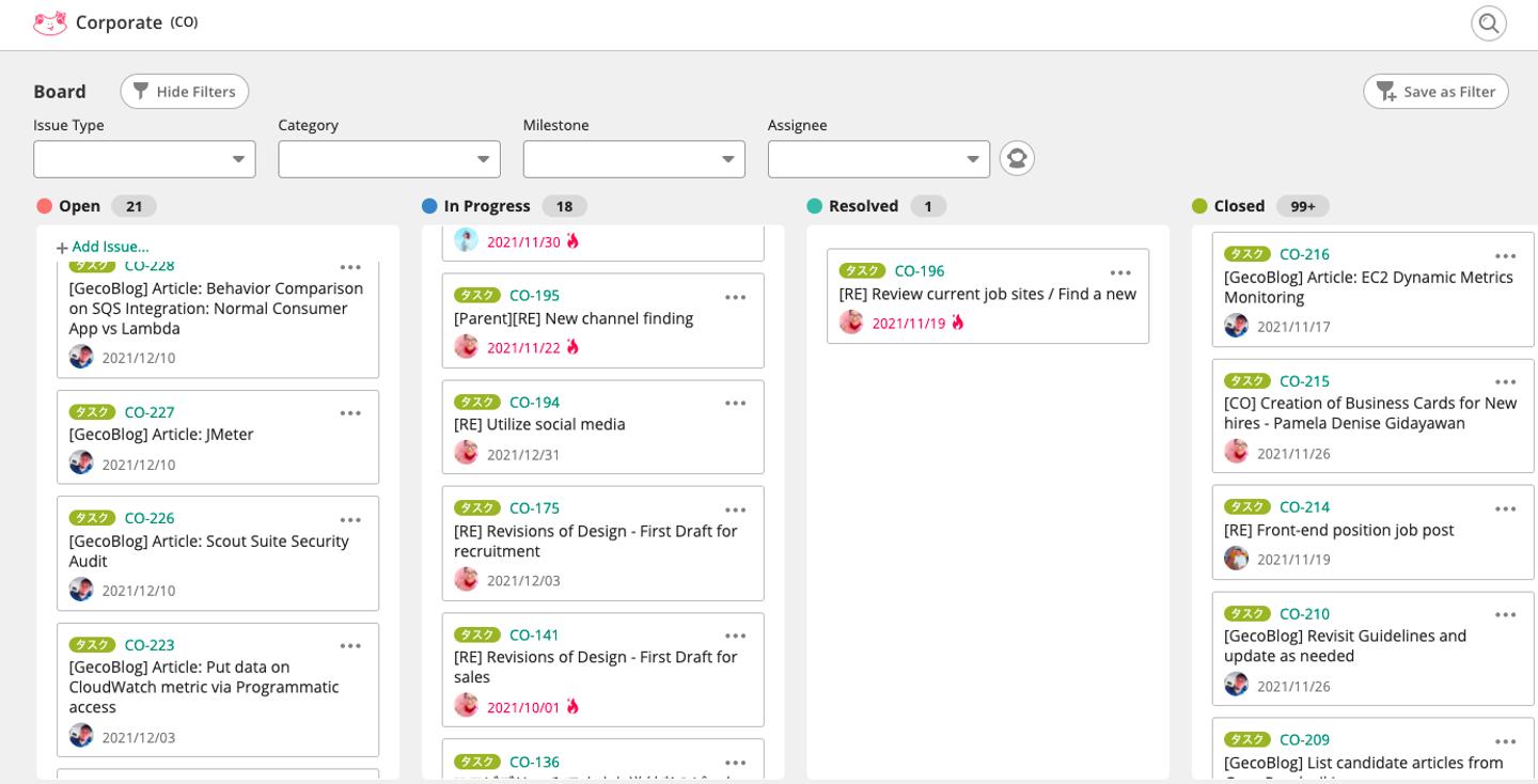 プロジェクトの進捗や各メンバーのタスク管理はBacklogというツールで行っています。チケットのタイトルからコメントも英語です。