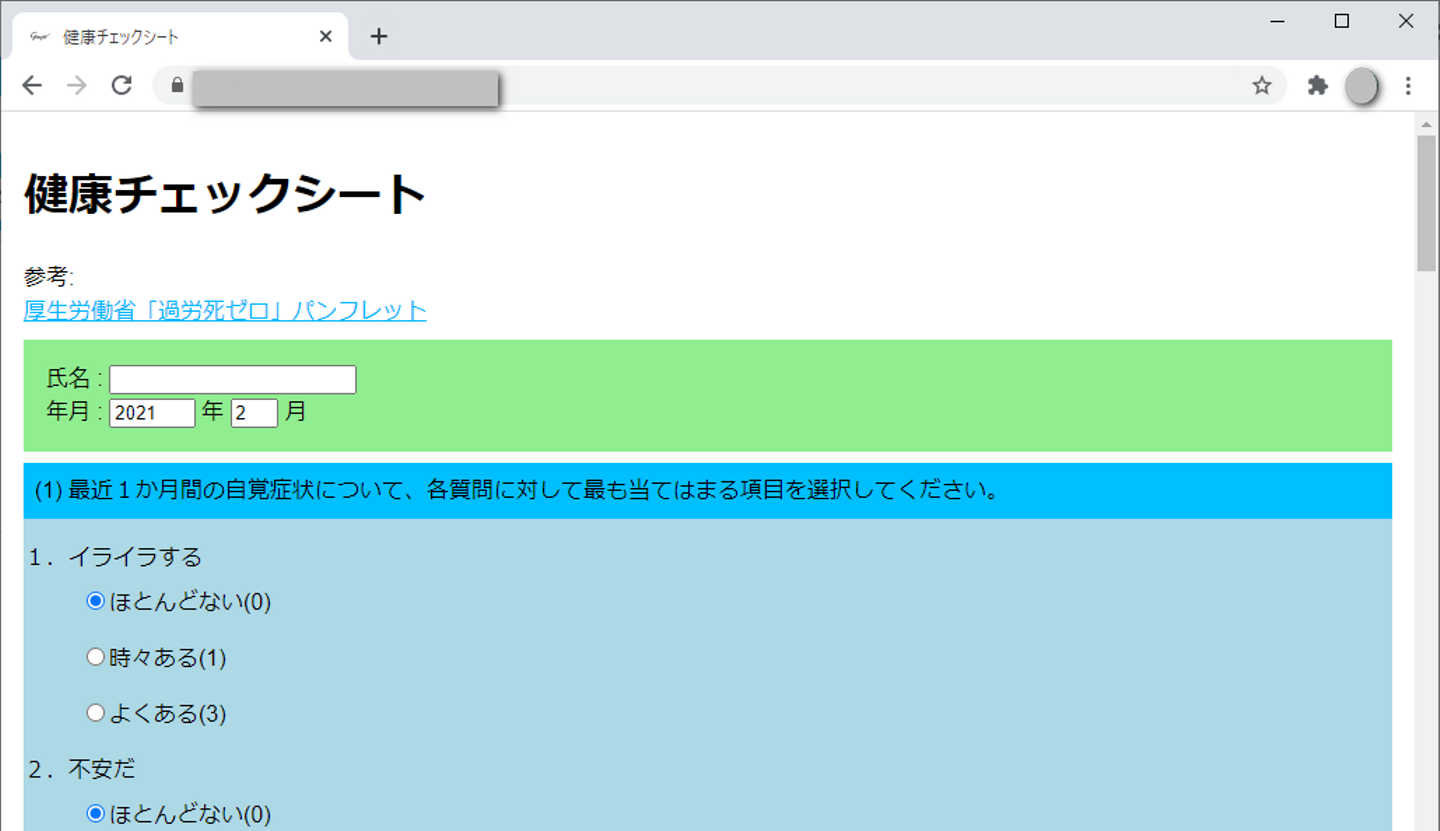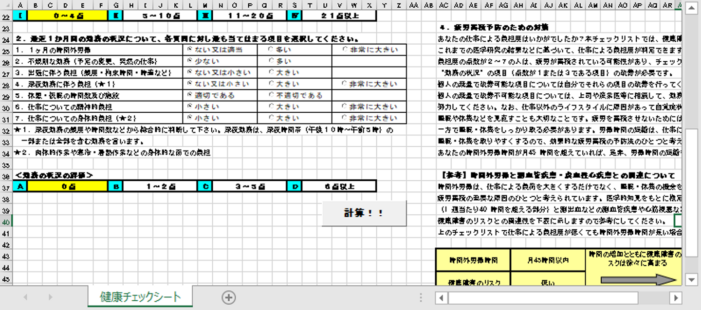 毎月一度実施される、社員の健康状態を把握するために実施されているチェックシートです。とある社員さんが、以前の会社で実施していたそうでそこから取り入れられたそうです。内容としては、厚生労働省から出されている「労働者の疲労蓄積度自己診断チェックリスト」を使用しています。