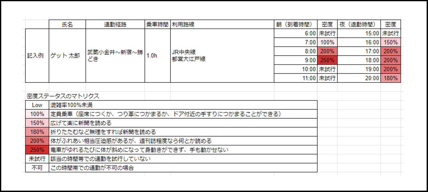 今回のチャレンジを達成するため、現在、各社員が通勤時に使用している公共交通機関の混雑率の可視化を行っています。なお、「満員電車」の定義や「混雑率」のパーセンテージについて、社員間に認識の差が見受けられたため、国土交通省による「混雑率の目安」を参照すべき基準としました。混雑率100%以上を「満員電車」と定義した上で、社員は自身の使用する公共交通機関について、普段利用している時間帯、および時差通勤を行った場合の時間帯の混雑率を記録していきます。