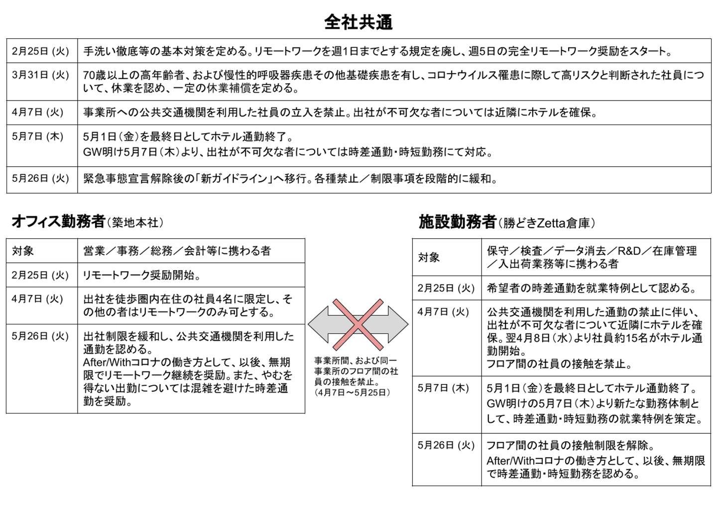 弊社では「新型コロナウイルス対策本部」を設置して新型コロナウイルス感染症(COVID-19)感染拡大防止に当たって参りました。緊急事態宣言発令期間中は公共交通機関を使用した通勤を禁止とし、本社勤務者は週5日の完全リモートワークへと移行。施設勤務者は4月7日~5月1日の期間は近隣にホテルを確保し事業を継続、ゴールデンウィーク以降は始業は6時~11時、終業は15時~22時の間で調整し、利用者の少ない時間帯に公共交通機関を利用できるようにしています。
