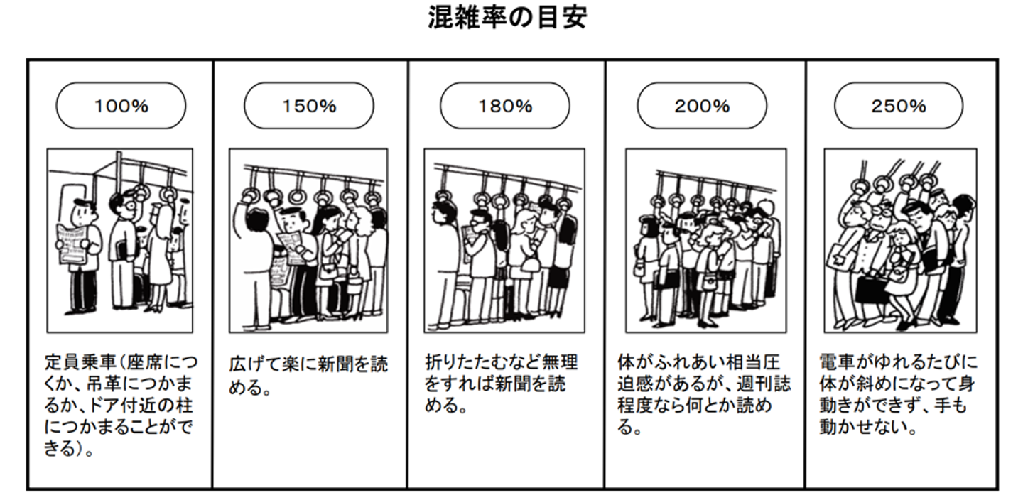 ▲社員間の満員電車についての基準を合わせるため、国土交通省による「混雑率の目安」を活用。