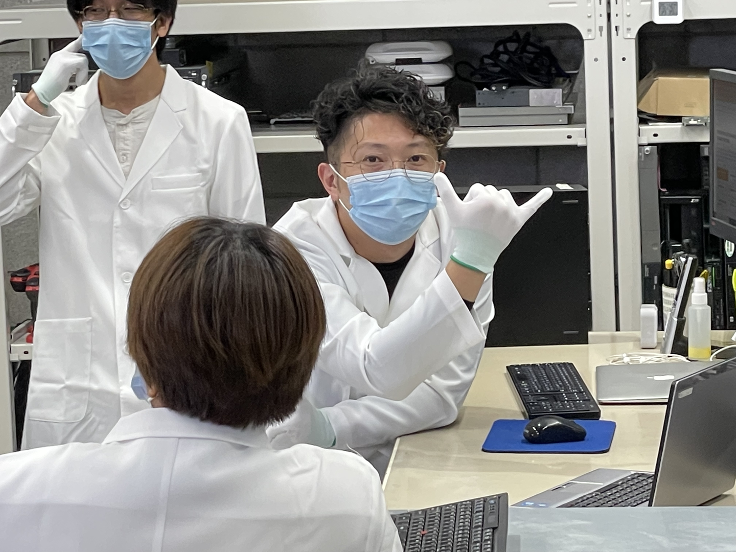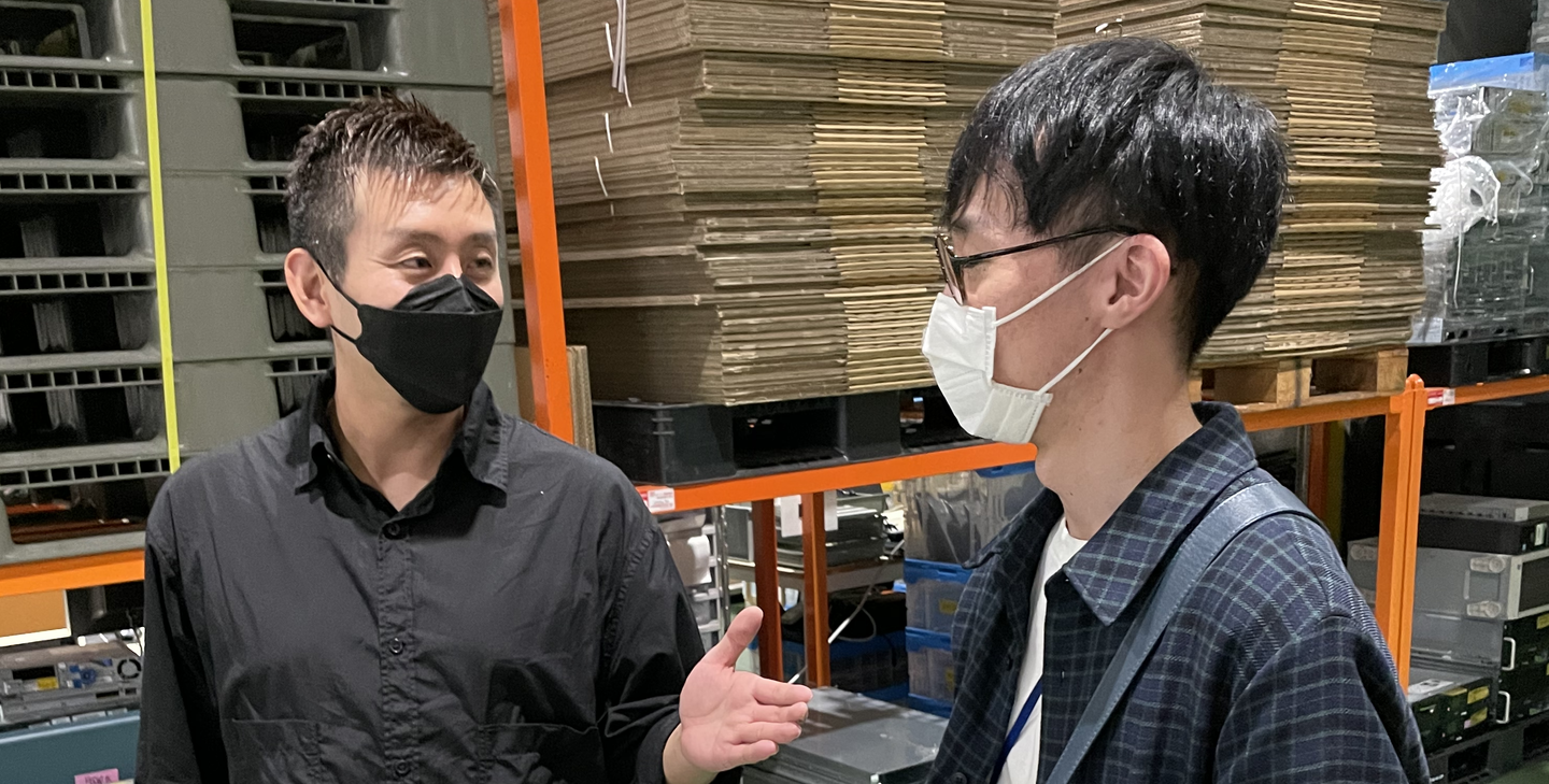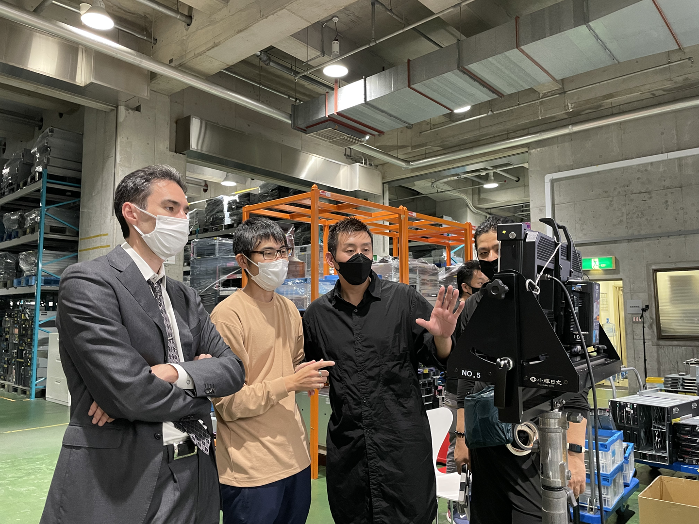 続いて、倉庫のロケハン(ロケーション・ハンティング=ロケ地を探す下見)のアテンドを担当した、ロジスティクス部門のリッキーさんと陽介さんです。(写真の派手なポロシャツの2人)。